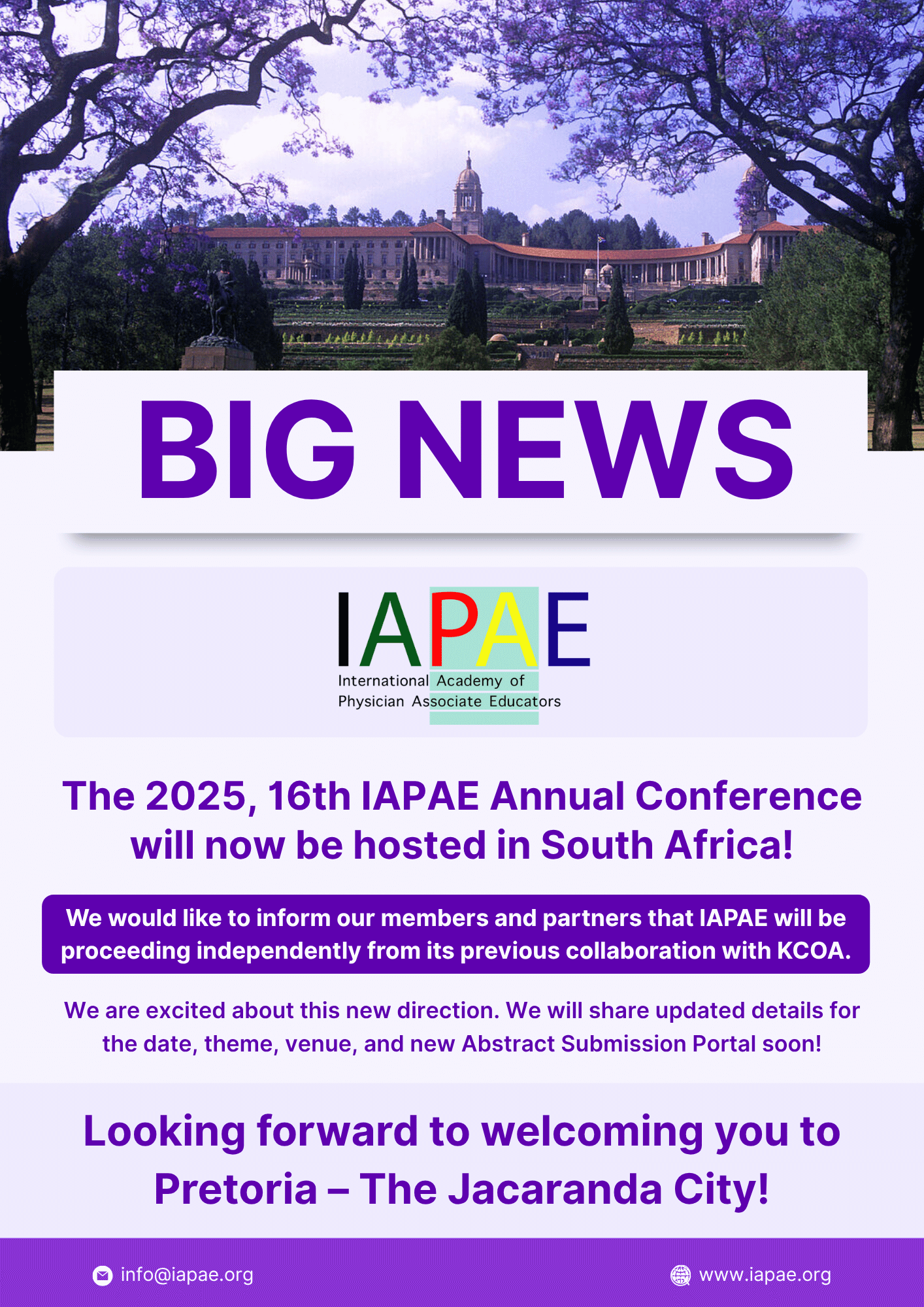 We would like to inform our members and partners that IAPAE will be proceeding independently from its previous collaboration with KCOA. We are excited about this new direction. We will share updated details for the date, theme, venue, and new Abstract Submission Portal soon! Looking forward to welcoming you to Pretoria – The Jacaranda City!